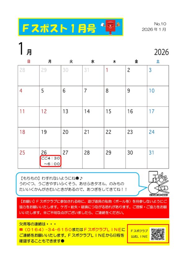 ※欠席等のご連絡は、0164-34-6150またはFスポクラブ公式LINEにご連絡をお願いいたします。