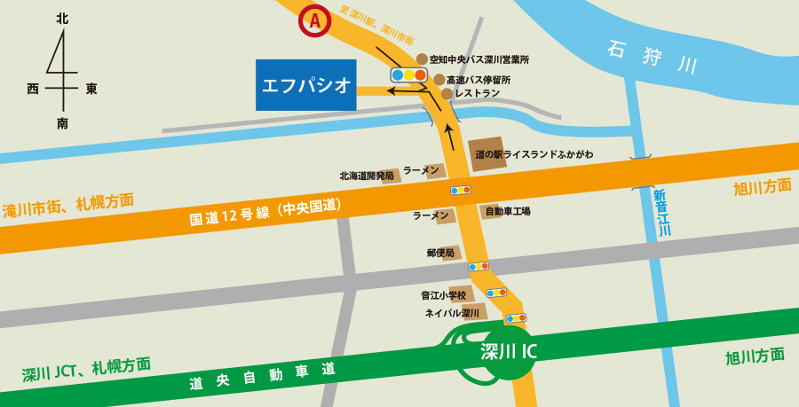 | JR深川駅からお車で | 約 10分 | 深川駅前の通りを南進し、深川インター方面にお進みください。石狩川を渡り暫く進むと、[A]の地点に出ます。空知中央バス深川営業所さんの前の信号を右折して下さい。 |