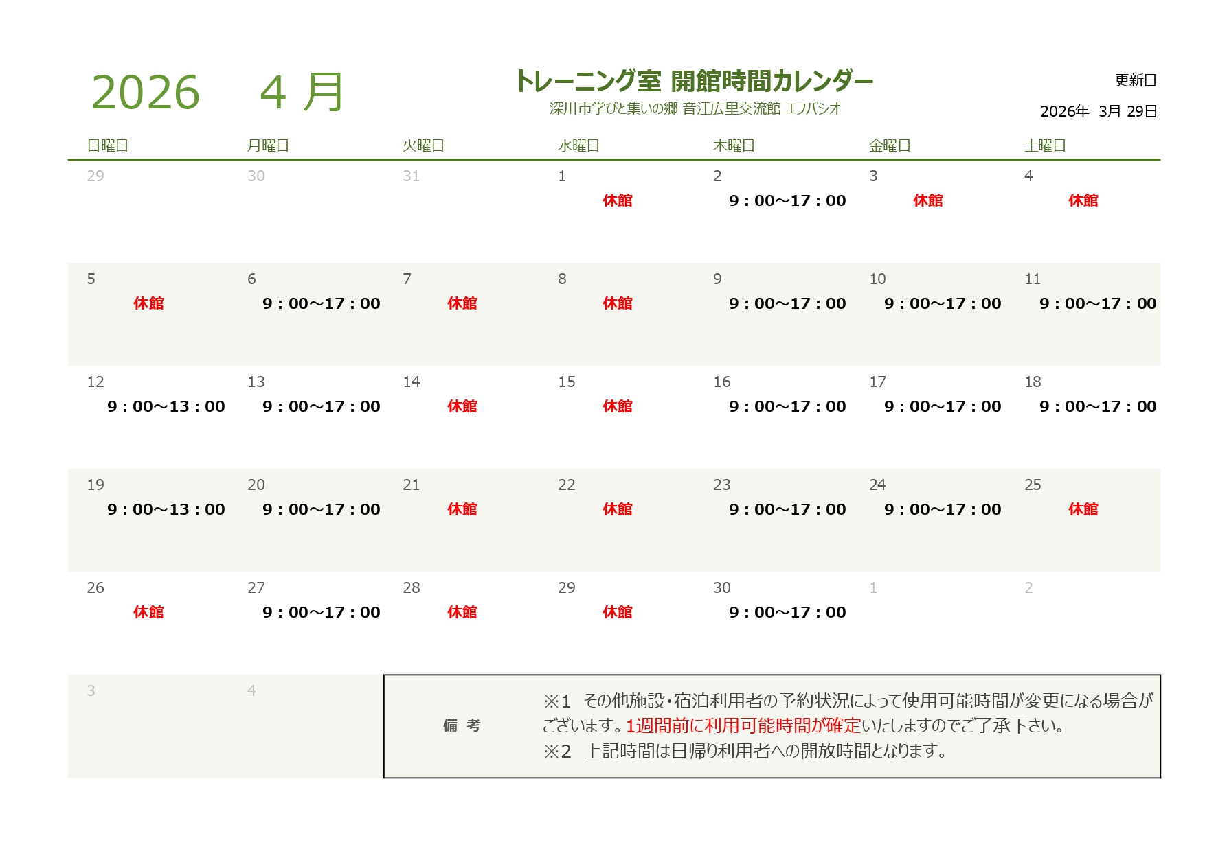 【3.29更新】R8年 4月トレーニング室 開館時間カレンダー